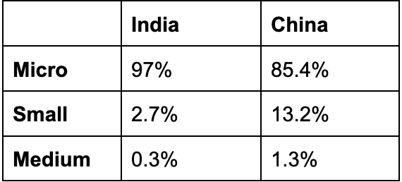China has roughly 5x larger proportions of small and medium-sized firms within the MSME category as compared to India. There may be taxonomical differences in the data sources on Indian and Chinese firms, but the 5x difference is massive.