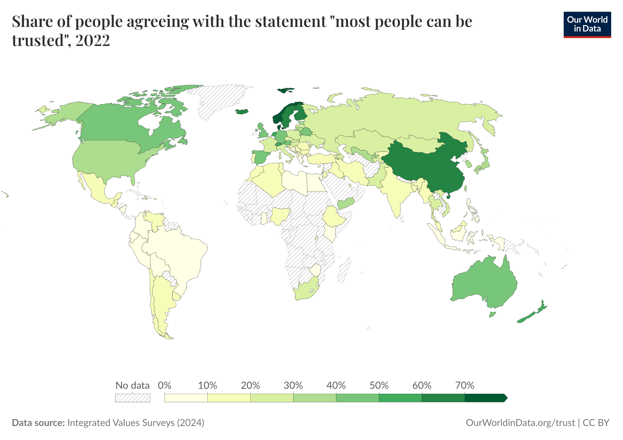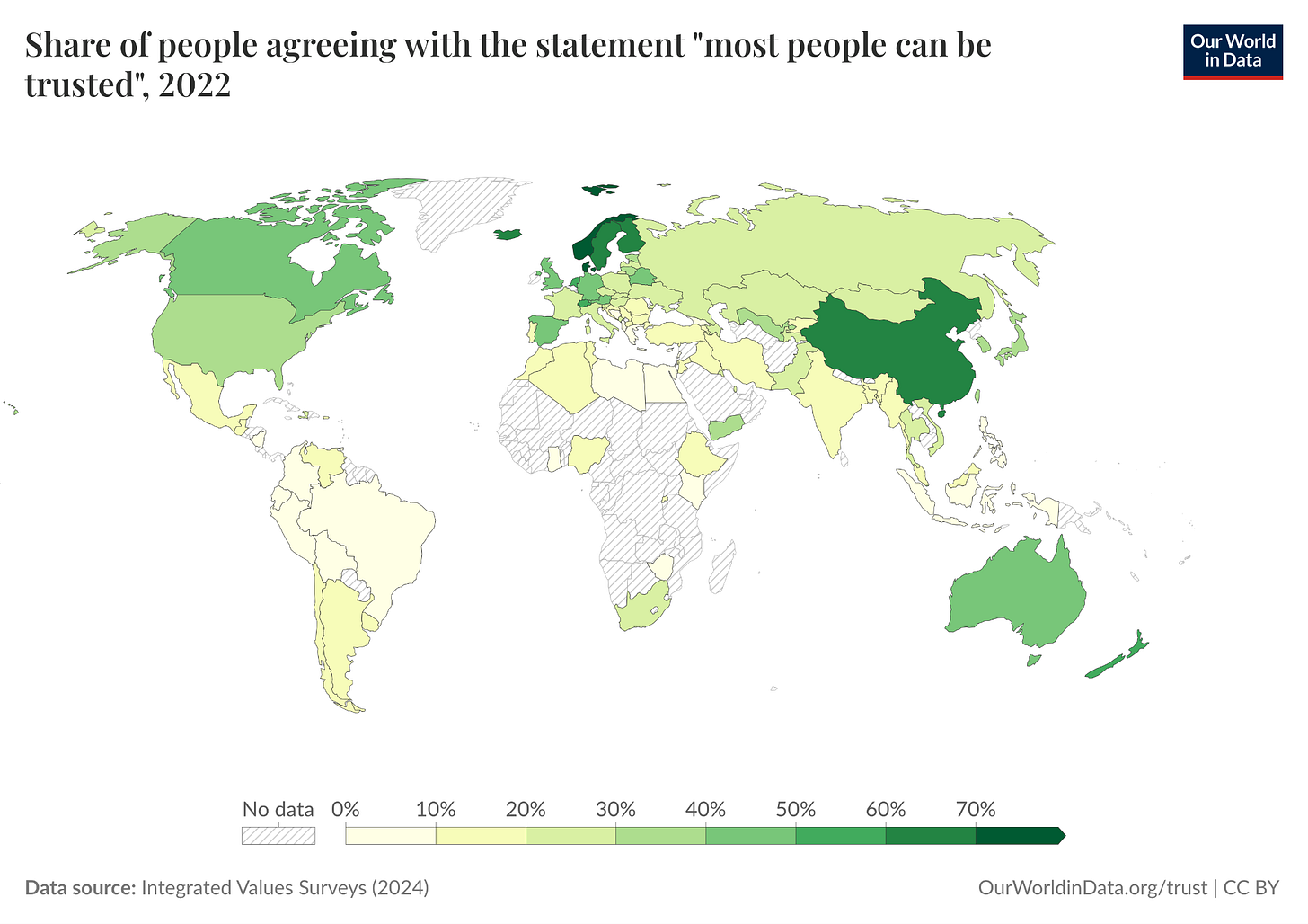 Researchers regularly measure the level of generalized trust in a society by asking people the question “Generally speaking, would you say that most people can be trusted?“. The “could you leave the doors to your car or house unlocked while you’re away” kind of trust.