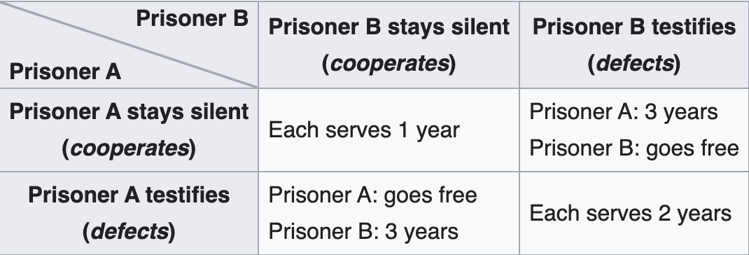“Two members of a criminal gang are arrested and imprisoned. Each prisoner is in solitary confinement with no means of speaking to or exchanging messages with the other. The police admit they don’t have enough evidence to convict the pair on the principal charge. They plan to sentence both to a year in prison on a lesser charge. Simultaneously, the police offer each prisoner a bargain. If he testifies against his partner, he will go free while the partner will get three years in prison on the main charge. However,. If both prisoners testify against each other, both will be sentenced to two years in jail. The prisoners are given a little time to think this over, but in no case may either learn what the other has decided until he has irrevocably made his decision. Each is informed that the other prisoner is being offered the very same deal.”